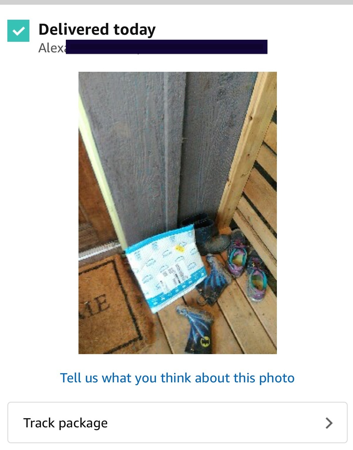 Yes, we have a pile of muddy shoes by our door. Doesn’t everyone this time of year? Seems like the perfect landing spot for our amazon packages, right? Apparently the delivery person thought so…